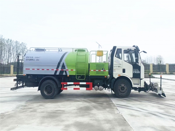 解放J6高壓清洗車是一種雙發(fā)動機、雙水泵清洗車,是在標準二類底盤的基礎上,加裝高壓沖洗系統(tǒng)、低壓沖洗系統(tǒng),由機械、液壓(氣路)、電器三部分合為一體的專用沖洗作業(yè)車。本車具有獨立的高、低壓兩套水路系統(tǒng),為清洗車工作提供壓力水源。其工作原理是:利用高壓水泵產(chǎn)生的高壓水,經(jīng)噴水架的高壓噴嘴噴出,利用高壓水流的動能,以高壓力、低流量的方式進行清洗,強力去污,高效節(jié)水,能將路面的陳舊污漬清洗干凈;或高壓水經(jīng)左(右)角噴噴出,清洗路緣、人行道及護欄隔離區(qū);使用高壓噴槍還可清洗路標、廣告牌、高架路等;噴霧系統(tǒng)具有強大的噴霧降塵、噴撒空氣消毒劑及調(diào)節(jié)空氣濕度功能。